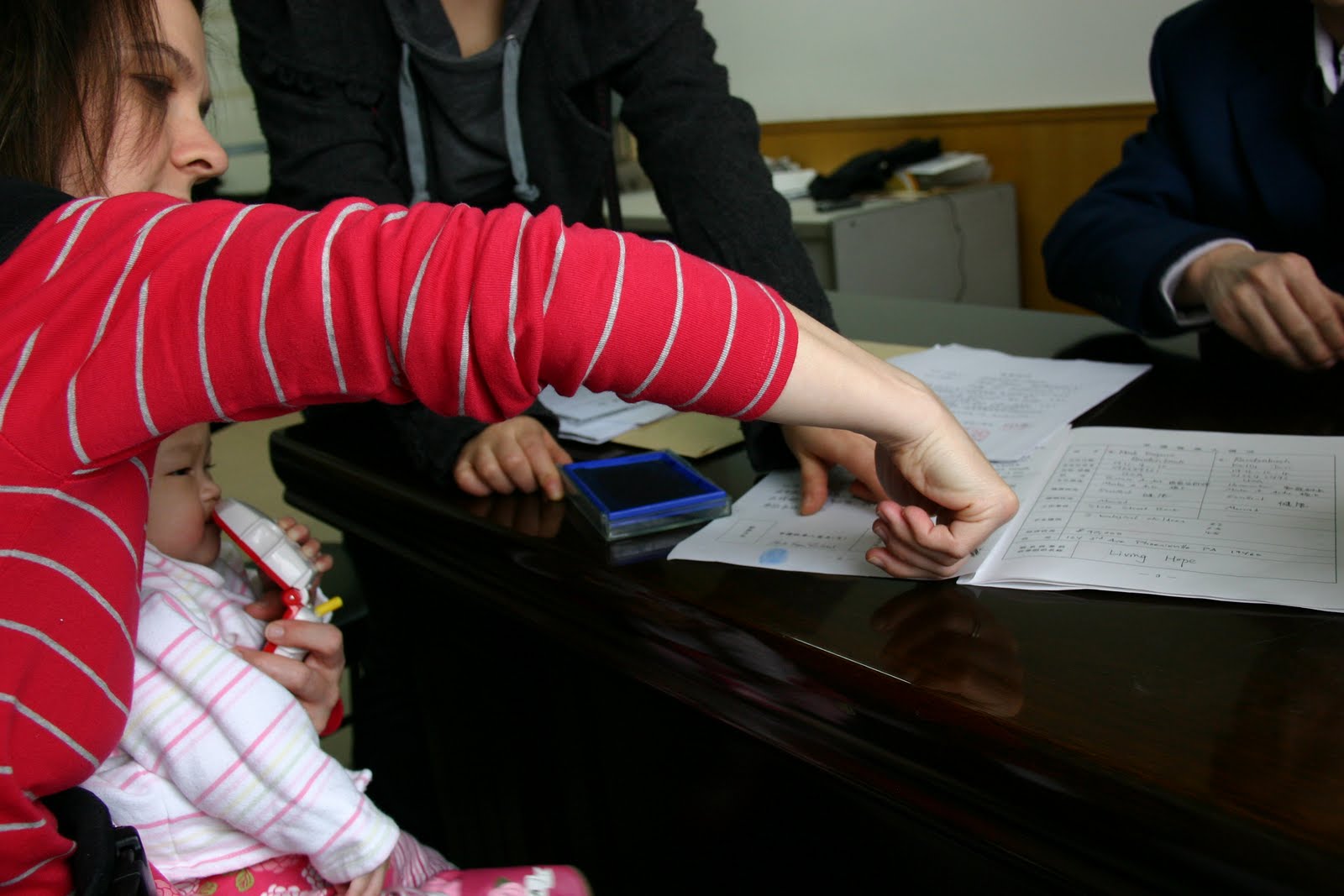 We sat at the desk of the civil affairs official while he reviewed all our paperwork. Then, he started asking some questions (through our interpreter): How many kids do you have already? What are their ages? If you have 3 kids already, why do you want to adopt? Describe your jobs. Are you prepared and able to handle another child? Describe the plan you have for her future education and medical needs? Did you get all the information you wanted about the child? Do you have any questions about her or about Chinese adoption laws? Is she acceptable to you? Finally, the official gave us a sort of blessing, saying that she will no longer live the life of an orphan but that she will have a family and that he is glad she will have a mother and father and have a happy life. It was a significant moment to hear those words. Then, we signed a bunch of papers (there were in Chinese, so not sure what exactly we were signing. But, we knew they meant she would be ours) and even had to put our fingerprint next to our signatures. Then, Lydia had to have her tiny footprint placed next to ours. She has been marked as our own. We gave our gifts to the official, the orphanage directors, and the notary (chocolate bars with an American flag on the wrapper and a pack of handmade stationery with American quotes about the family, etc. on them). Then, the directors said their goodbyes to Lydia. They were not emotional though they smiled and seemed pleased that we were so happy with the baby. We thanked them for taking such good care of her. I really do believe they care for their children well and enjoy seeing them adopted. We had brought pictures of another child from their orphanage who had been adopted back in 2006. The mother sent it to me before we left to give to them. They smiled and seemed pleased to have the updated pictures and know she is doing so well. And, they even brought their own camera and took a family picture of the three of us.