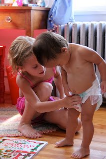 Love this!!!! What a GREAT big sister. It cracks me up when Emerson does that squat. :)