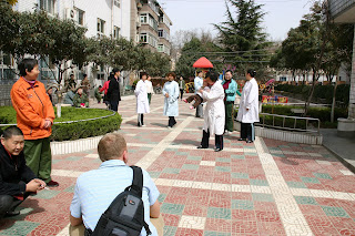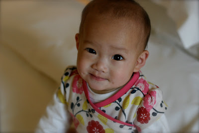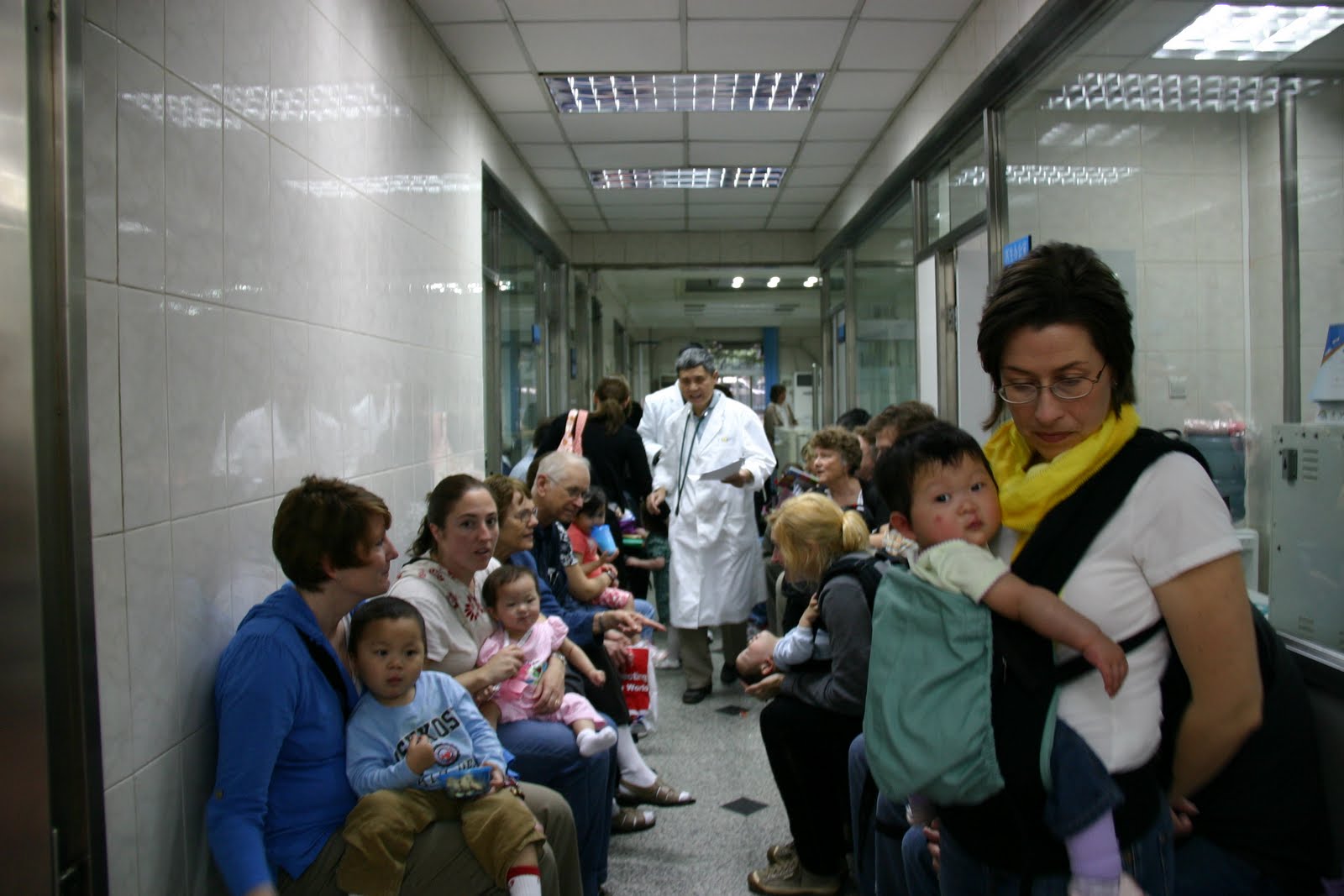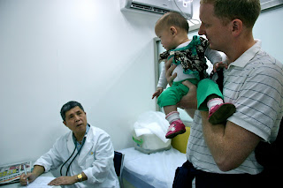 We walked to a photo shop to get visa pictures taken of all the girls. Then, we headed over to the medical clinic. I had walked into that building expecting chaos just from following other families’ blogs. My expectations were pretty much met–though the pictures just don’t do it justice. You gotta see the video and hear the noise to really get it. But, we were fortunate that we were one of the first groups of families to arrive so we did get in and out of there quickly. We took Lydia to 3 different stations–general body check, ENT, and measurement check. I particularly got a kick out of how they checked her hearing–the doctor just hit “demo” on a small keyboard on his desk and waited to see if she’d look at it. As soon as she turned her head, her test was done. Her measurements were basically the same as the last ones we got from her orphanage except for her weight. We were told she weighed nearly 18 lbs. I’m guessing they weighed her with all of her puffy clothes on because even in her clothes today, she weighed not quite 16 lbs. She’s the size of an average 5 1/2-7 mo. old American baby (considering weight and height) which is why she looks pretty funny walking. Though many of the children at the clinic were screaming (poor Ellie was one of them. She was screaming before the doctors ever looked at her AND she needed a TB test and 5 shots. Poor baby.), Lydia was no worse for wear. She didn’t need any shots (though she’ll need all of them once we get home. She hasn’t had any.), and she promptly fell asleep in Mark’s arms afterwards. She seems to like a little morning cat nap.