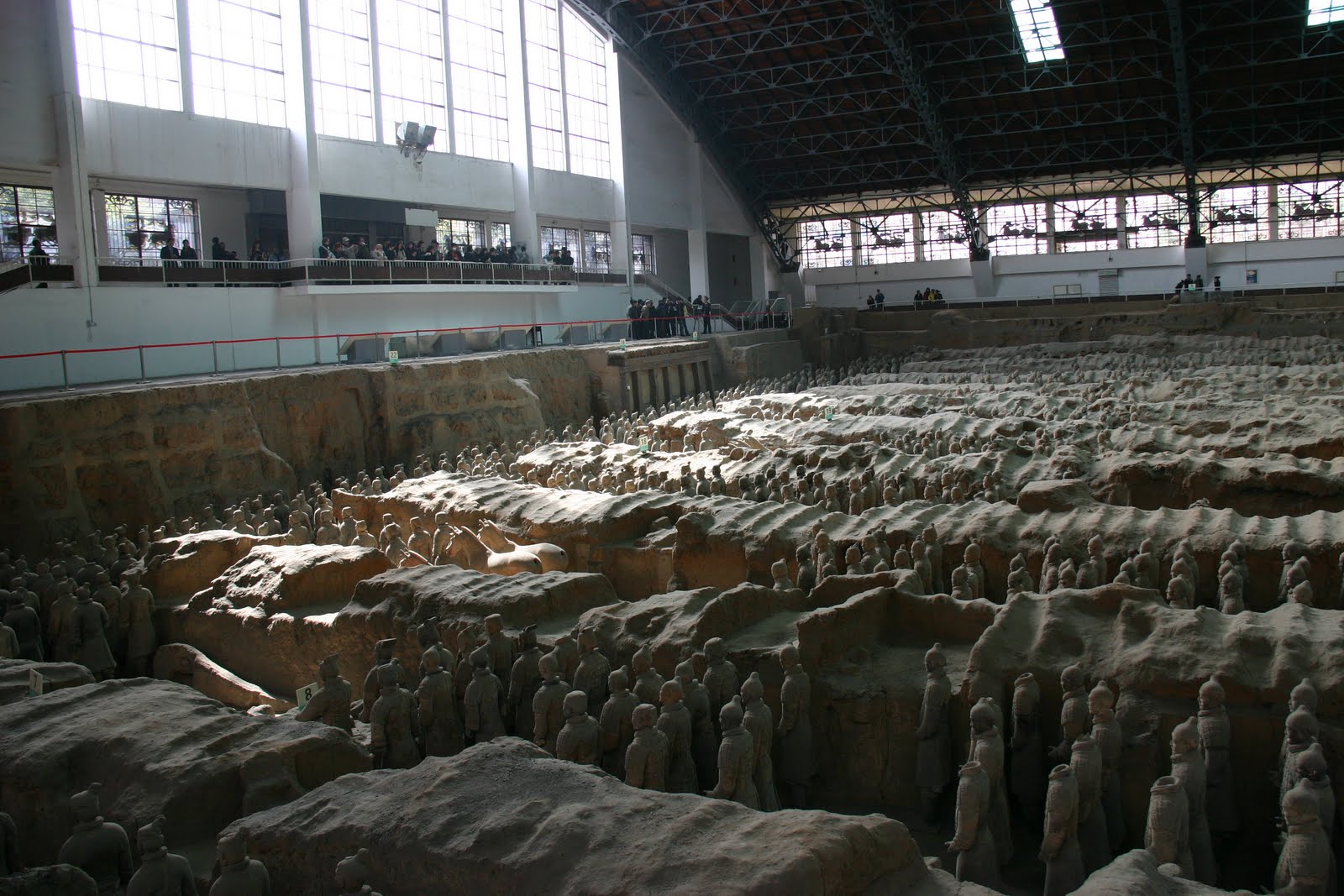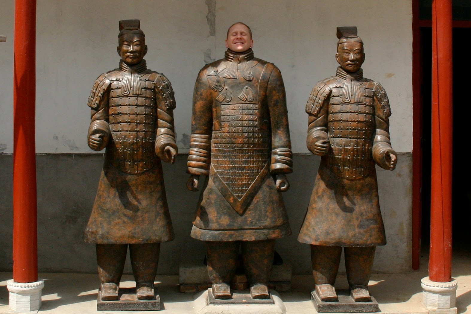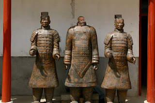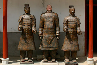 Since we missed a day of touring due to the terracotta warriors’ revenge we suffered from on Wednesday, we decided to fit in visiting the famous site yesterday on our travel day which made for a busy day. We checked out of our hotel early and then drove the 45 minutes to see this amazing attraction. Thousands of terracotta warriors were found here in the 1970s by a farmer (apparently there were 2 very, very human looking ones–see the pictures?) He reported the find to the government who took over the area, recognizing that it was something special. The farmer, as compensation, was given a job at the museum. He just sits there and signs his name in tourist books all day everyday. Each warrior was made uniquely to represent different members of the imperial army and were set up near the emperor’s tomb to protect it from attack after he was buried. Very odd to consider. But, the emperor started building them when he was only 13 years old. So, guess he just didn’t know better??? Jason–you’d be proud of Mark. He told me he’d give me 100 yuan if I jumped the wall and got up on one of the terracotta horses and pretended to ride it. Can you imagine my facial expression back? I think I’d be getting myself a quick ticket out of China if I took him up on it. We also visited a lacquer furniture workshop and shop where they create new terracotta warriors and learned how they make them. They actually fire them in cave like areas under ground using coal. We got some prizes there for our kids (cannot say what they are since they read these posts, but can you guess?) and had one last really good lunch in Xi’an. We have decided that we are terrible at ordering. Every meal we ordered ourselves pretty much stunk. The meals that guides ordered for us have been amazing. So, we quit. If we have to eat out again with no guide, I may very well go to a neighboring table and just ask some random Chinese person to order for us.