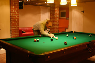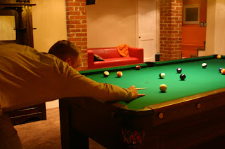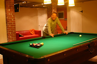 I remember visiting Mark’s Grammy’s house before we were married. He took me down into the basement where there was a small room with a very large pool table in it. He proudly patted the table and told me that his name was on that thing. It was a very old table that Mark’s grandfather had bought cheaply from a billiards hall that was going out of business. They grew up playing with it in that basement. Eleven years later, here we are. After Grammy died at Christmas time, Mark’s mom asked him if he still wanted the pool table. He said no–we didn’t have the space and it was huge, how would he get it, it just wasn’t going to work. I encouraged him to reconsider. I knew he loved this table and would regret it years from now if he didn’t have it. So, he reconsidered and our major house project ensued. We finished our root cellar (a dirt floor room off the basement that we never used) to become our storage room. Then, we finished the basement to be a man cave of sorts–I say “man cave” but frankly it’s a pretty cool room that I like to hang out in myself. Last night at nearly 10PM, the guy fixing up the pool table for us finished. Check out these pictures from moments after “the Pool Doctor” left. Mark looks pretty darn excited.