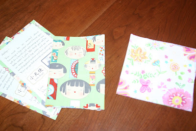 The second package I got was from a new email friend Jonni. She emailed me back in May as she was waiting for the referral of her second child from China. She was frustrated because the special needs shared listing had come out the day before and she had not been matched as she had hoped. I suggested to her to have her agency check the listing the next morning because I suspected that files would be unlocked which had been locked the day before. She did just that and was matched with the most beautiful little girl who they have named Samantha! Go to her blog here and sneak a peek at both her gorgeous little China dolls. Look how cute the fabric is she sent too–little China girls on it!