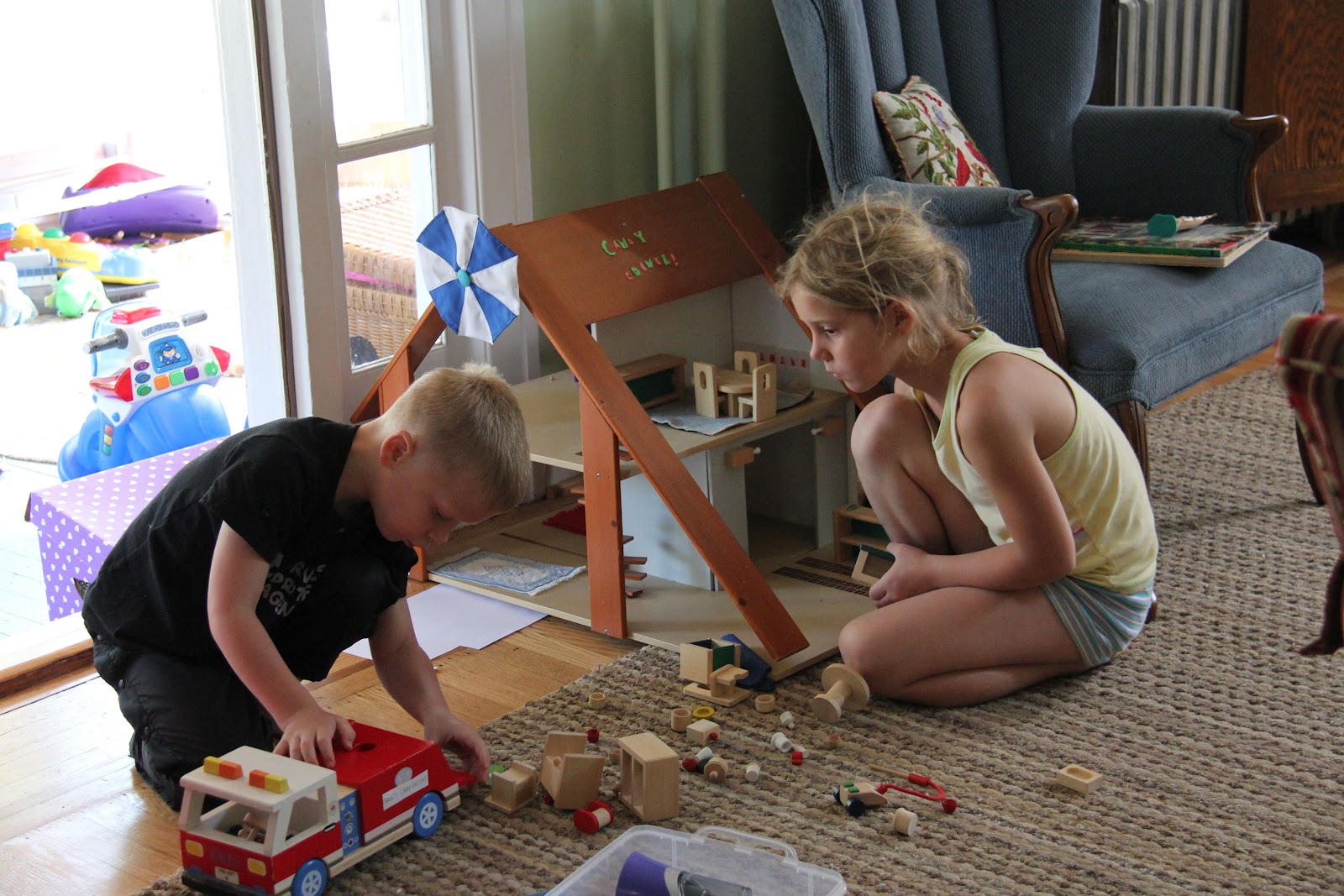 The wooden firehouse and doll house haven’t been played with in a while. But, on a summer morning when the “What should I do?”s started, these toys were reincarnated.
