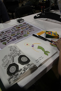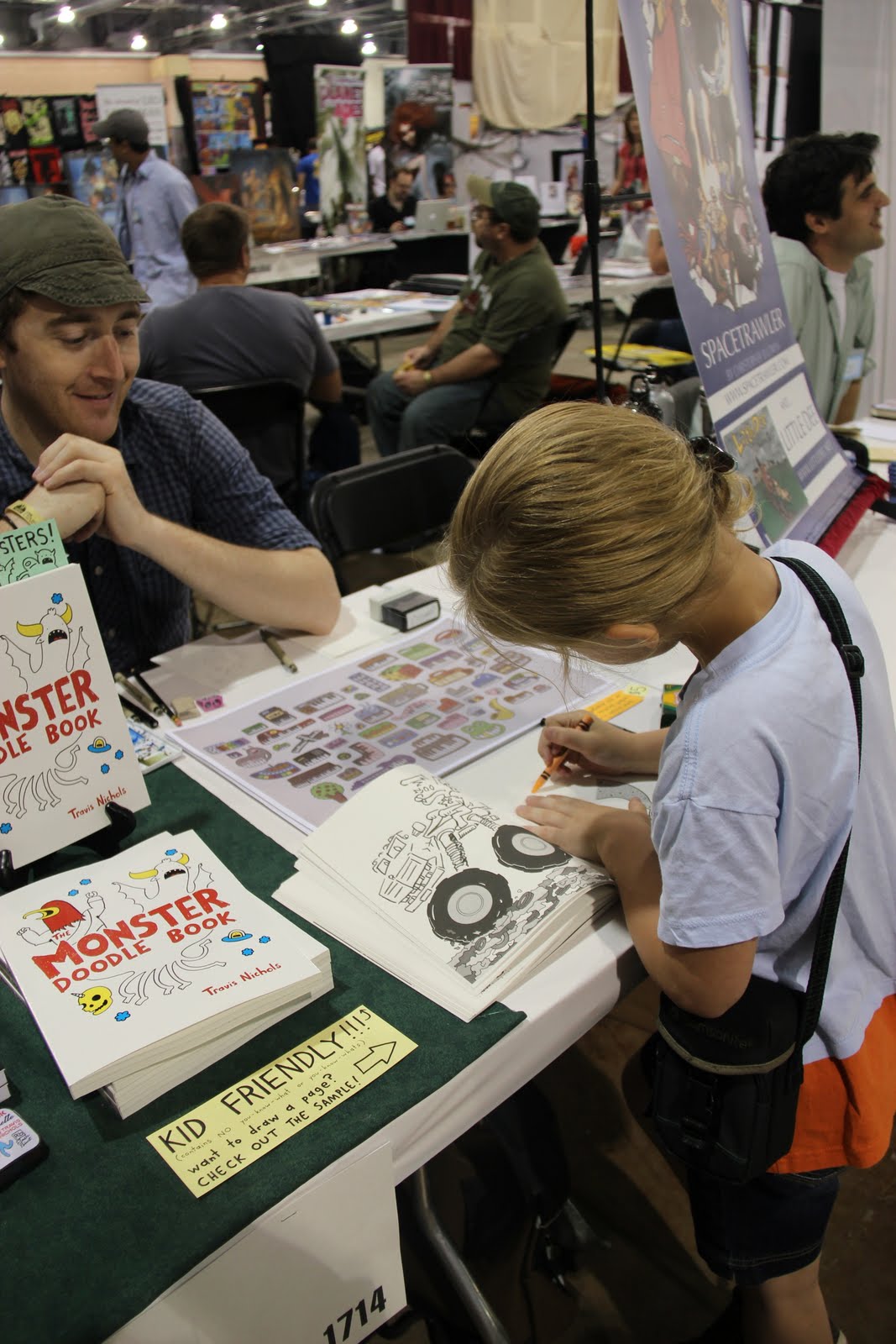 We got to see some famous comic illustrators at work including Travis Nichols (one of the few really kid friendly ones) who published The Monster Doodle Book. He talked to us for a bit and encouraged my kids to illustrate themselves in a sample of his book…which they loved and I ended up buying. Hook, line, and sinker.