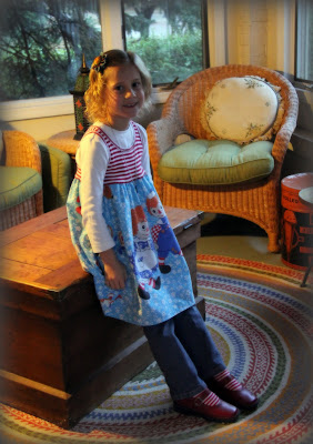 I have a really cool vintage Disney pillowcase I wanted to make into a tunic top for Ashlyn. But, I didn’t want to ruin it with my first attempt at it. So, I made this yesterday out of an old tank top we had and some old Raggedy Ann and Andy sheets from when I was little. I’m so happy with how it turned out. It’s super cute. And, I loved it with the red striped socks and red Mary Janes today.