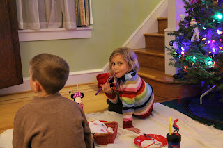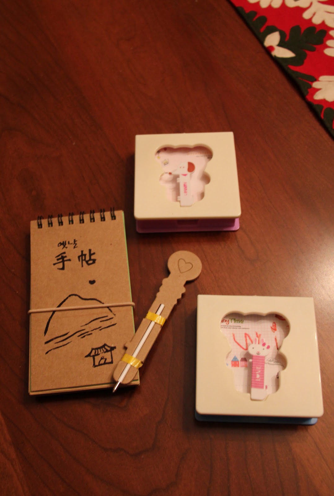 On the 2nd day of Christmas, Nanma and Grandaddy gave to me…a notepad with a nifty cardboard pen for the three older kids and a little fork and spoon set for Lydia complete with teeny chopsticks.