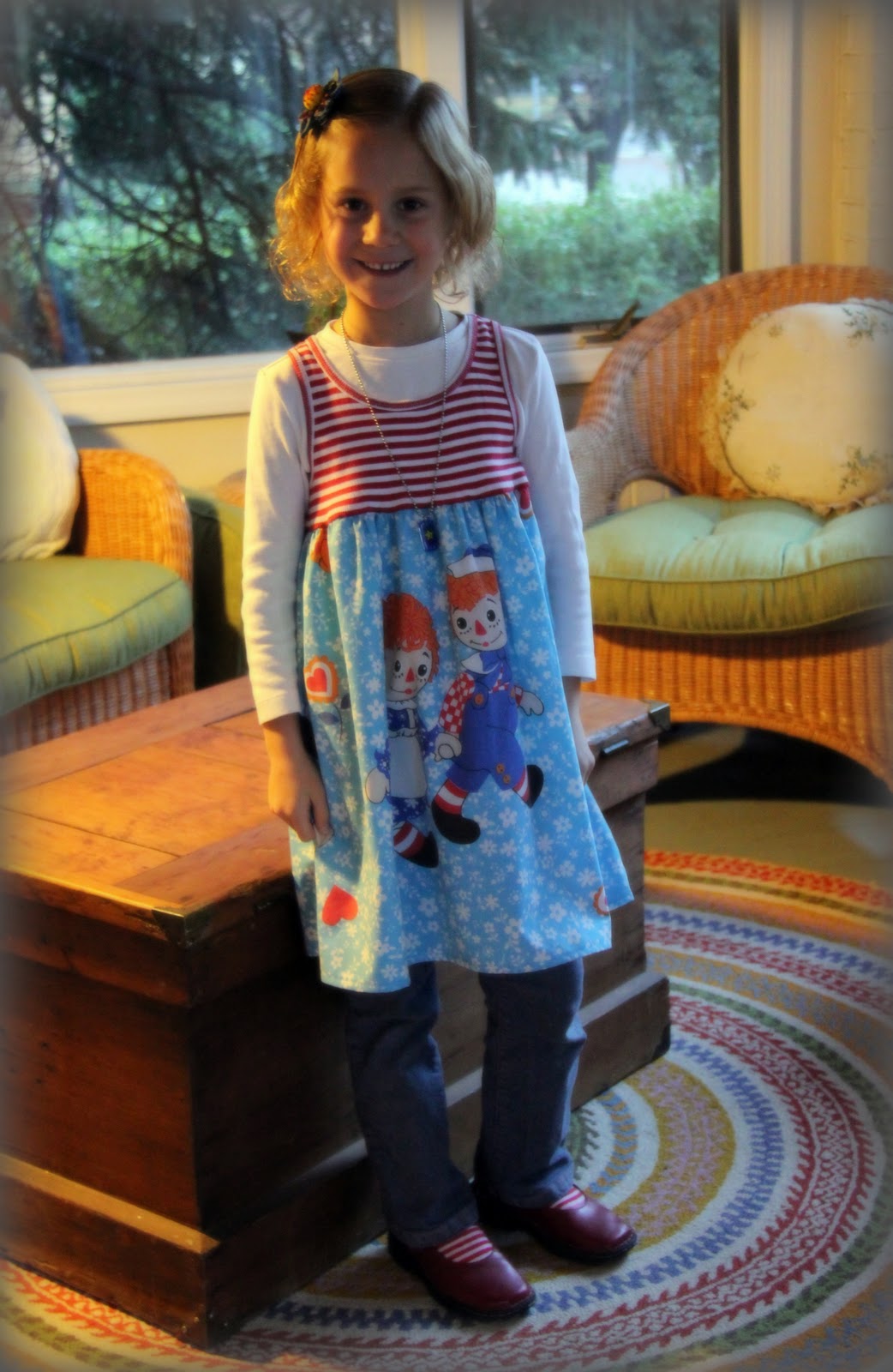 I have a really cool vintage Disney pillowcase I wanted to make into a tunic top for Ashlyn. But, I didn’t want to ruin it with my first attempt at it. So, I made this yesterday out of an old tank top we had and some old Raggedy Ann and Andy sheets from when I was little. I’m so happy with how it turned out. It’s super cute. And, I loved it with the red striped socks and red Mary Janes today.