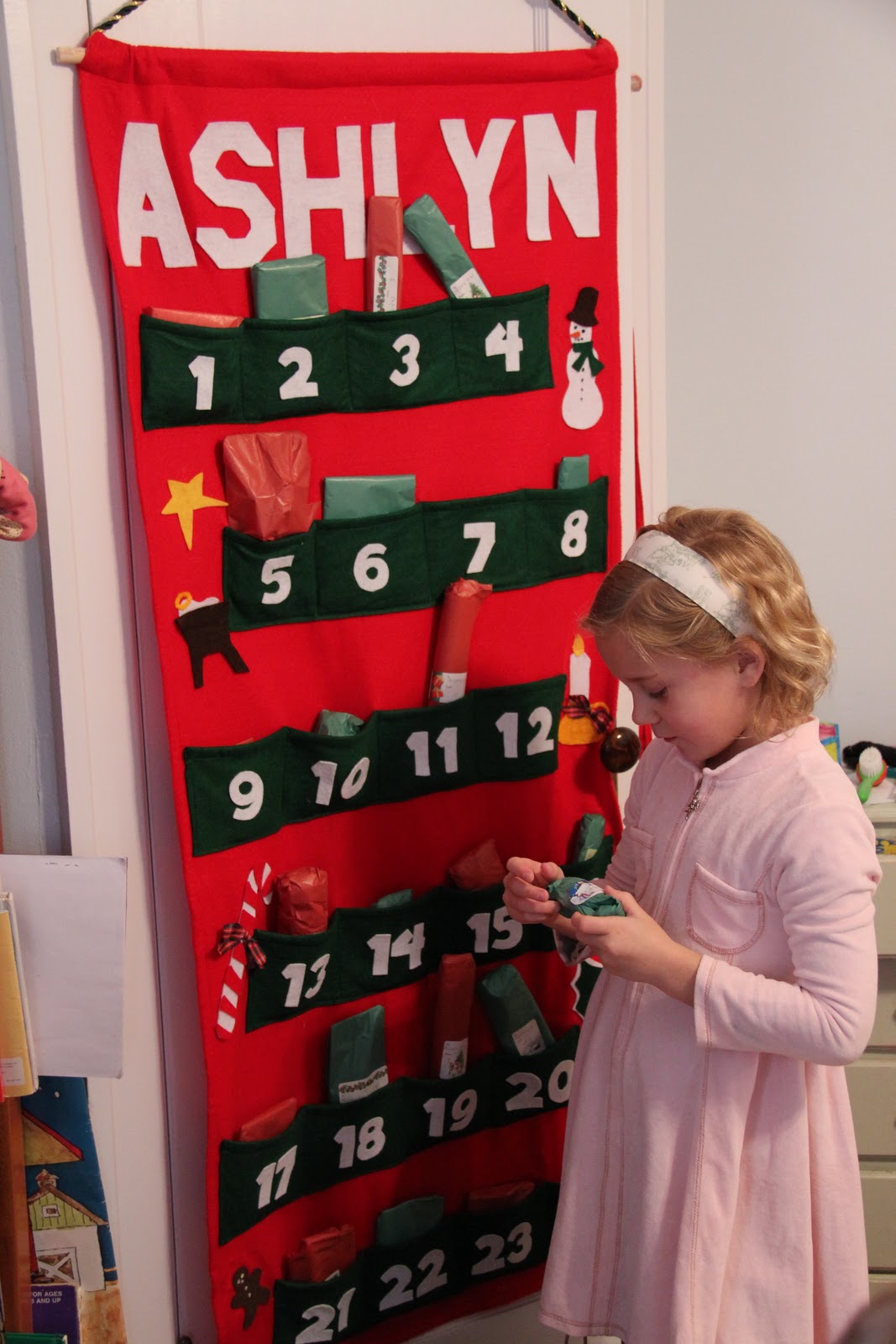 That’s 480 felt pockets with 480 little wrapped presents every December.