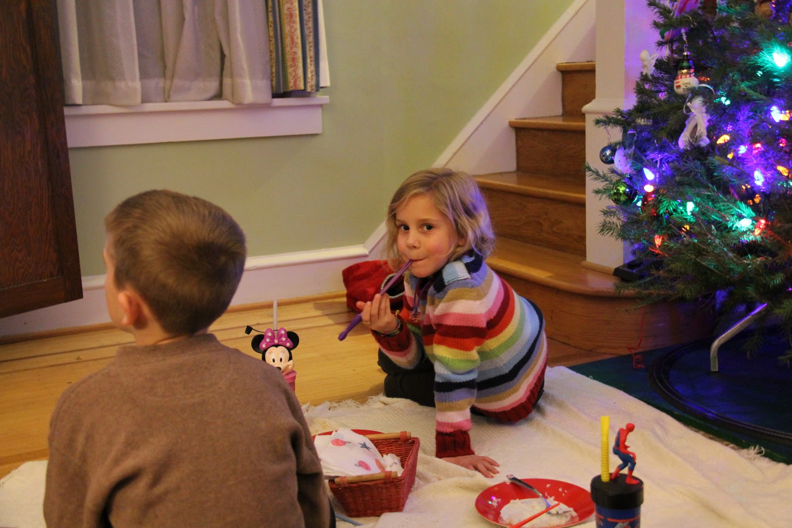 Pictures of the setting up which is oodles of fun in an of itself. Lots of trying to peek through the tissue paper and guessing what items might be from their shape.